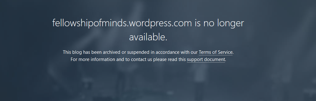 One Response to WordPress.com Shuts “Down Fellowship of the Minds” with NO Warning for Supposedly Violating ‘Terms of Service’ – Who’s Next?