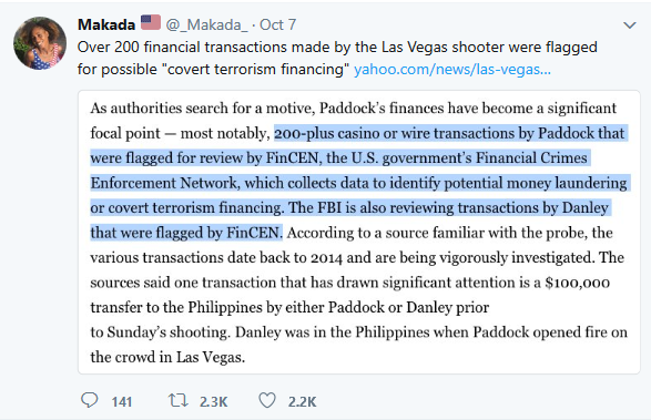 As authorities search for a motive, Paddock’s finances have become a significant focal point — most notably, 200-plus casino or wire transactions by Paddock that were flagged for review by FinCEN, the U.S. government’s Financial Crimes Enforcement Network, which collects data to identify potential money laundering or covert terrorism financing. The FBI is also reviewing transactions by Danley that were flagged by FinCEN. According to a source familiar with the probe, the various transactions date back to 2014 and are being vigorously investigated. The sources said one transaction that has drawn significant attention is a $100,000 transfer to the Philippines by either Paddock or Danley prior to Sunday’s shooting. Danley was in the Philippines when Paddock opened fire on the crowd in Las Vegas.
